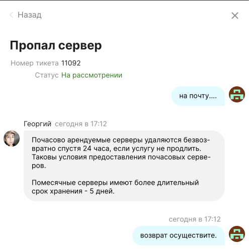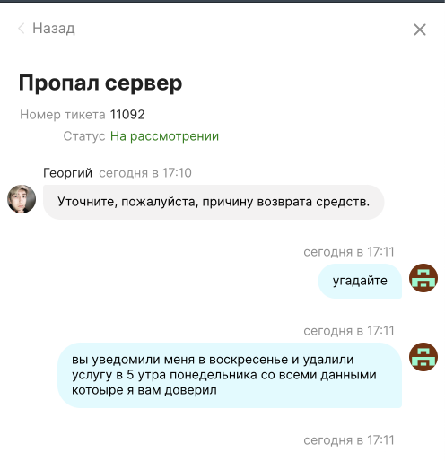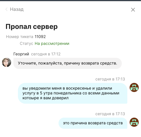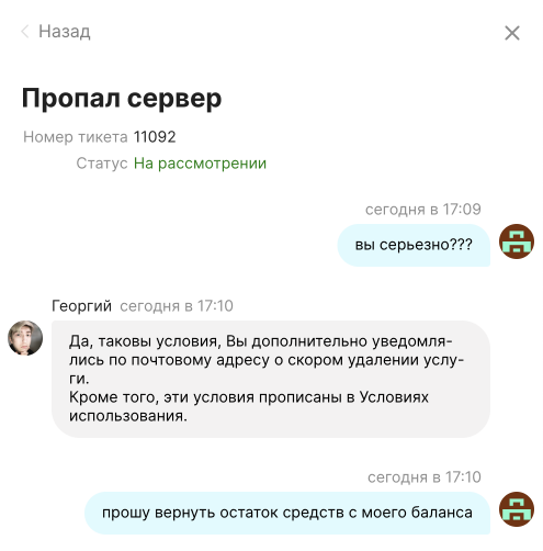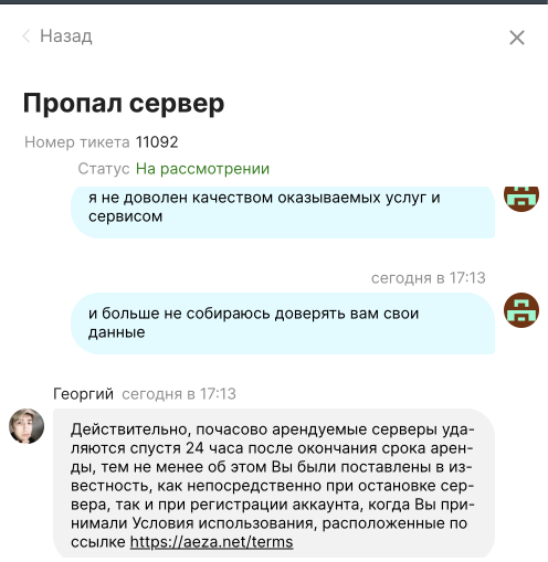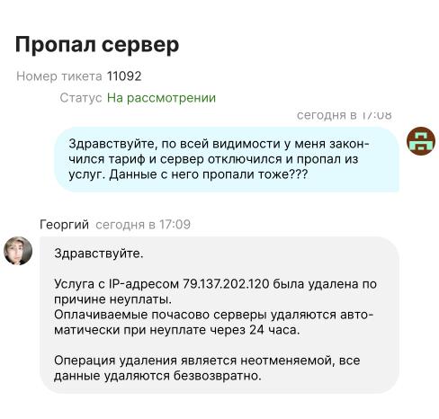 Заказывал выделенный сервер, дважды менял тариф по причине того что они не вывозили 4 потока парсинга озона в зенке. По итогу смирился с медленной работой сервера и продолжил пользоваться. Сегодня после выходных увидел что мой сервер удалили со всеми моими данными и несохраненными изменениями шаблонов от программиста, работа которого уплачена. Написал в поддержку – удален за неуплату в течение 24 часов после того как закончились деньги на балансе. Сам виноват что не читал пользовательское соглашение (так мне в поддержке и сказали), но это не главное.