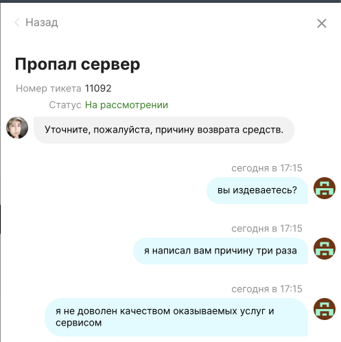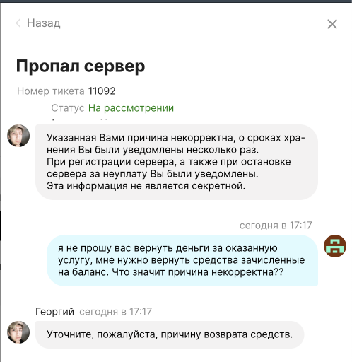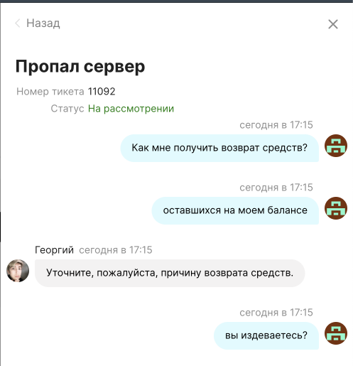 Попросил вернуть остаток средств на балансе (3 000 рублей) потому как не планирую продолжать пользоваться сервисом. Специалист поддержки общается как м*дак с долей издевки. Говорит что причина "Недоволен качеством услуг и не хочу более доверять вам свои данные" некорректна и возврат мне не светит, СТ 159 УК РФ – Мошенничество. Прилагаю скриншоты переписки с неадекватом из поддержки.