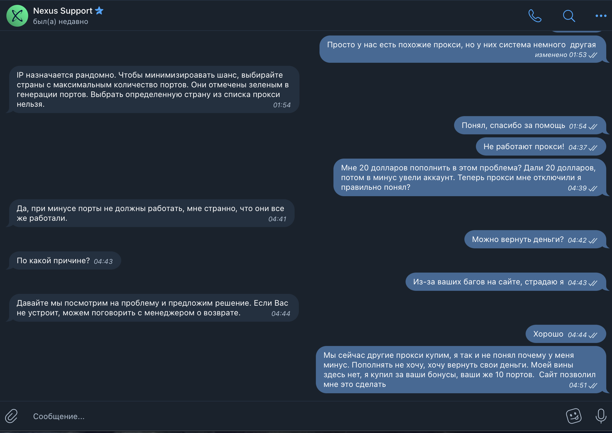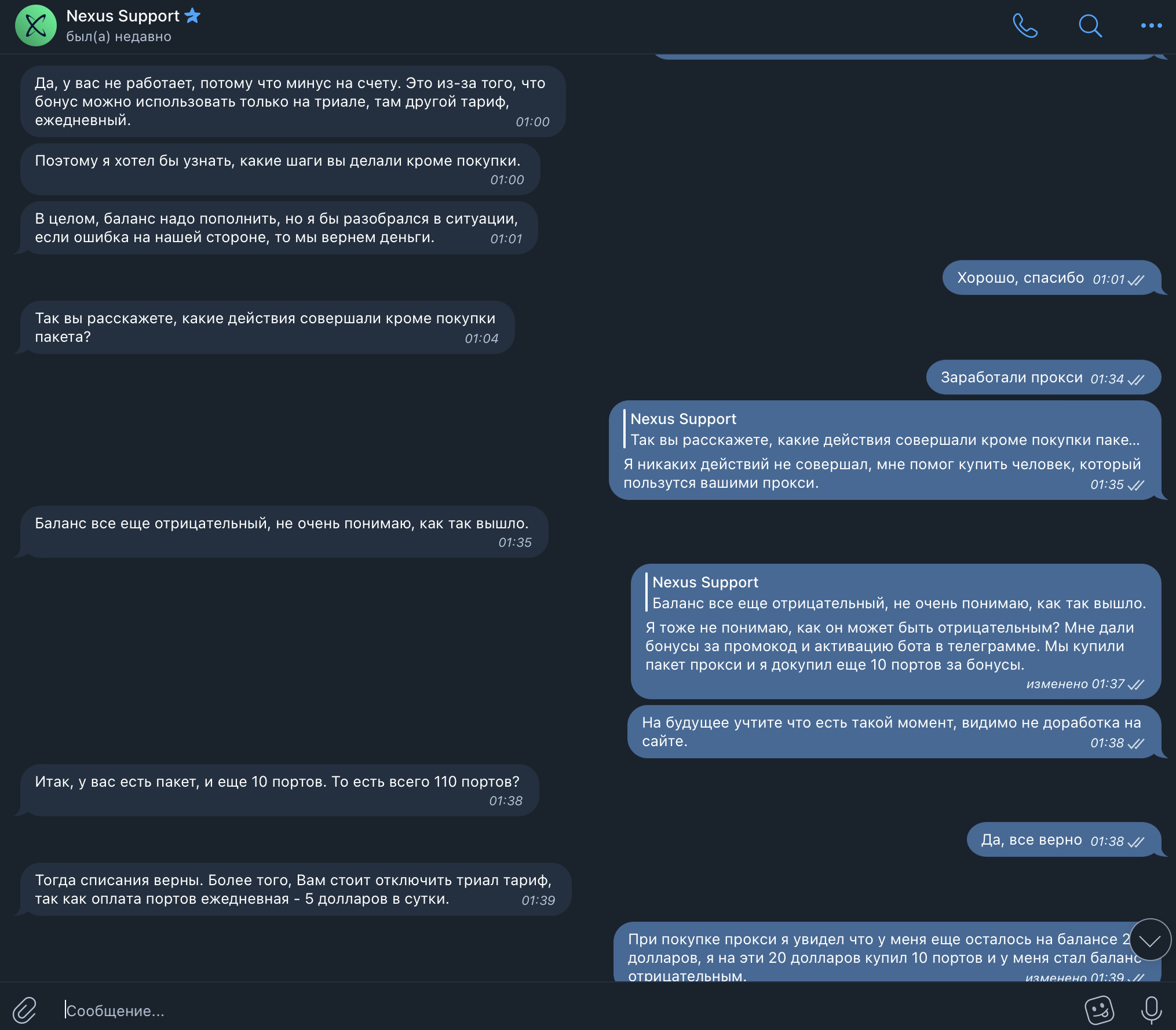 НЕ РЕКОМЕНДУЮ ДАННЫЕ ПРОКСИ! Купил пакет проксей за 100 долларов. При покупке дали бонусы в 20 долларов. На эти бонусы я купил 10 портов. И что вы думаете? Они обнулили мой аккаунт, увели его в минус! Отключили мне прокси и пишут что при минусовом балансе прокси не работают. Написал в тех поддержку, говорят что нужно пополнить 20 долларов и проблем не будет. А самое главное, они даже сами не понимают, что у них на сайте происходит. Я клиент, который первый раз зашел на сайт и должен знать как это произошло. Не понимаю политику этого сервиса. Возможно специально разводят людей на деньги! Предоставляю скрины переписку с тех поддержкой.