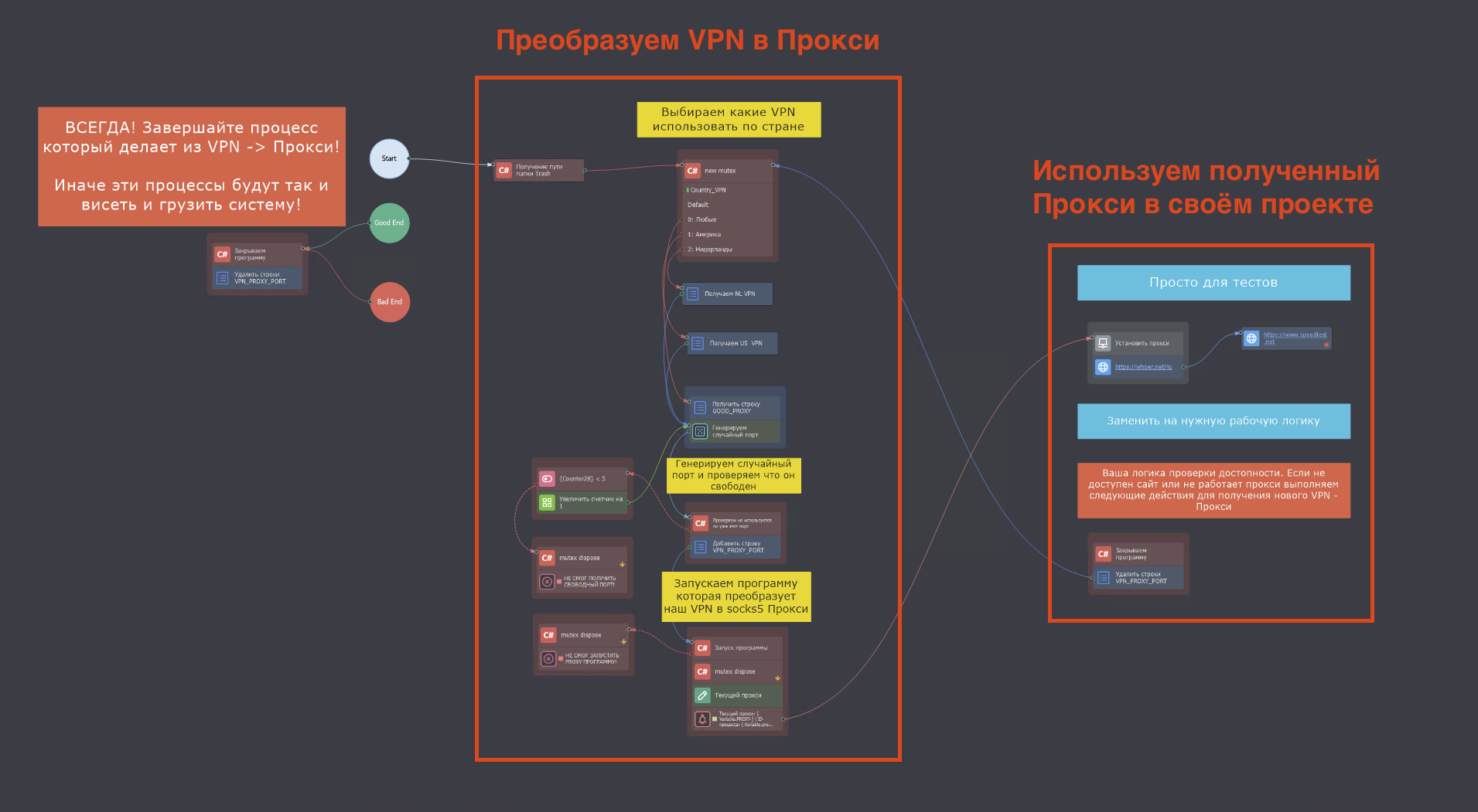 Автоматическое преобразование VPN в прокси: Шаблон автоматически преобразует VPN в SOCKS5 прокси, устраняя необходимость в ручной настройке. Все необходимые проверки и исправления уже реализованы, что позволяет легко работать с любым из протоколов Vmess, Vless, Shadowsocks, Trojan и WireGuard.