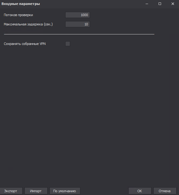 Запустил ProxyHab_v2.zp в один поток, в настройках потоков проверки значение - 10, чтобы не ждать долго и сохранять собранные VPN.