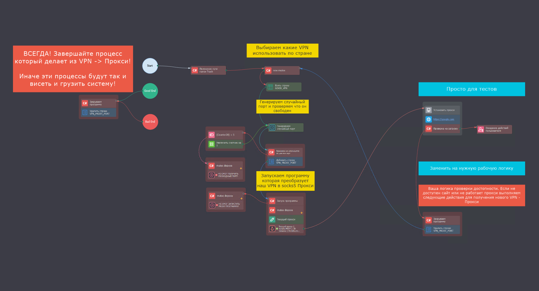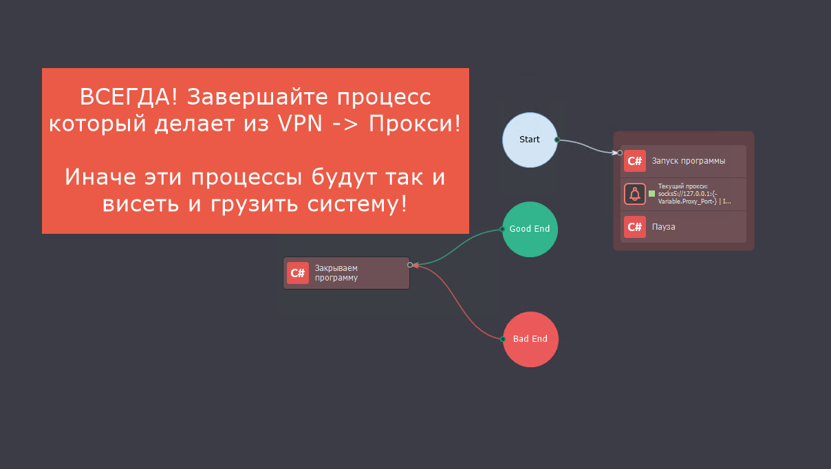 • Простая интеграция с другими программами: С помощью шаблона Launch_Proxy.zp вы можете настроить использование полученных VPN для создания прокси на определенном порту. Это позволяет применять эти прокси в любых других программах без необходимости разбираться в ZennoPoster.