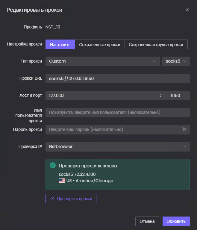 Не совсем понял описание, до запуска Профиля, Вы добавили сам прокси в Зб, прошли проверку на доступность, этот прокси привязан к профилю, после страт профиля идет, верно?