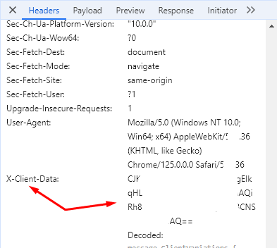мы увидим странный заголовок X-Client-Data. Он не передаётся на других сайт, только на ресурсах google.