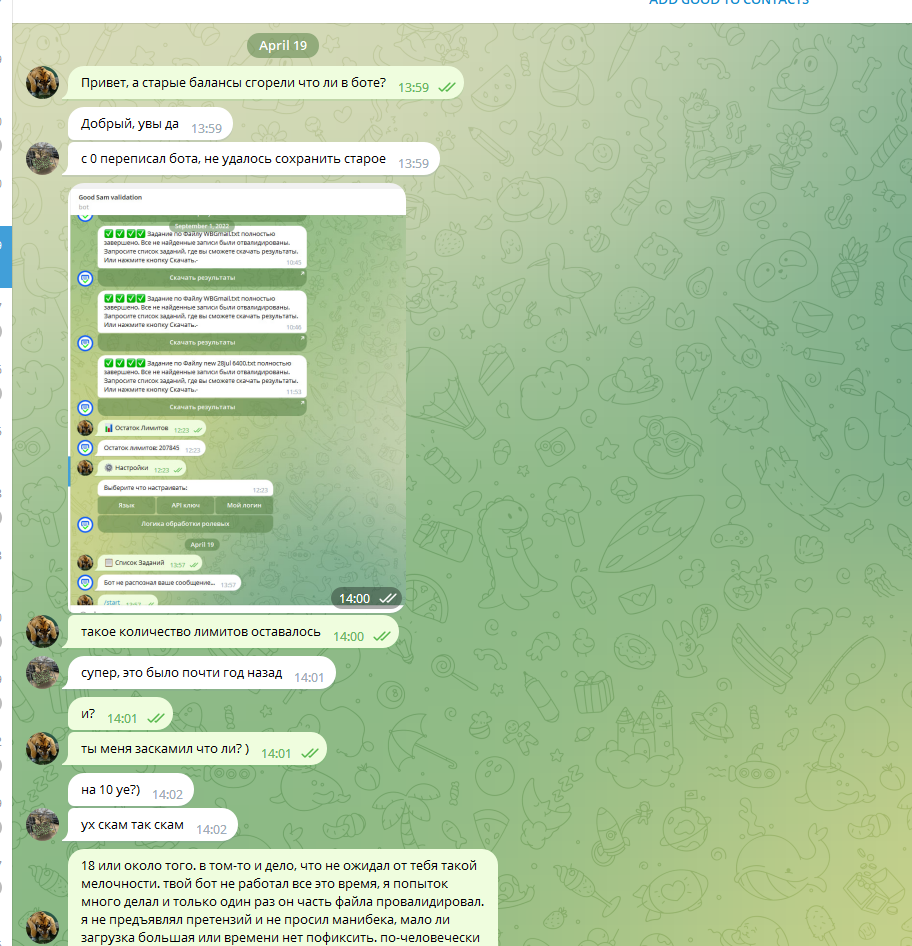 Сегодня ТС пишет, что бот перезапущен, акции скидочки, налетайте, мол. Захожу в бота - проверяю баланс, а баланс 0. Пишу автору в ЛС, прошу пополнить теми лимитами, которые были в боте, предоставляю скриншот для пруфа, но он отказывается. Год назад, говорит было это все. Лол. Мелочно и подленько. Честно говорят не ожидал от этого человека, но случилось как случилось.