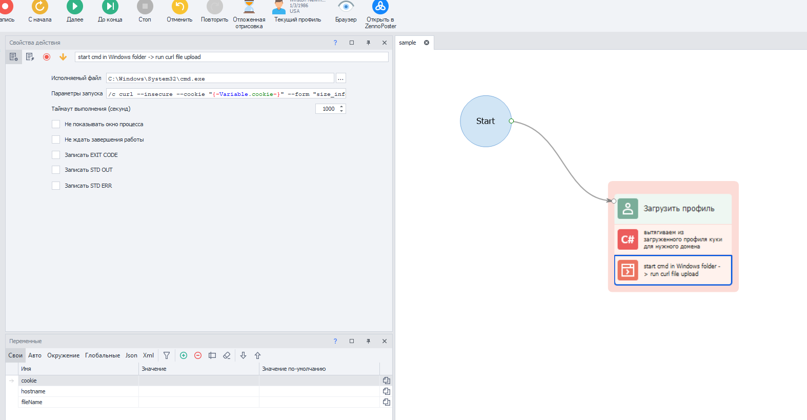 3) запускает cmd с параметрами запуска (где и указано что и куда заливать с помощью curl)