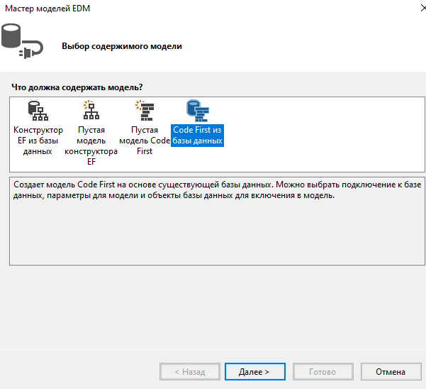 После установки создадим нашу модель, видов создания модели несколько, какая каким образом работает я рассказывать не буду, почитаете в гугле если интересно, а мы выберем пустую модель Code First, это создание БД на основе кода который мы с вами напишем.