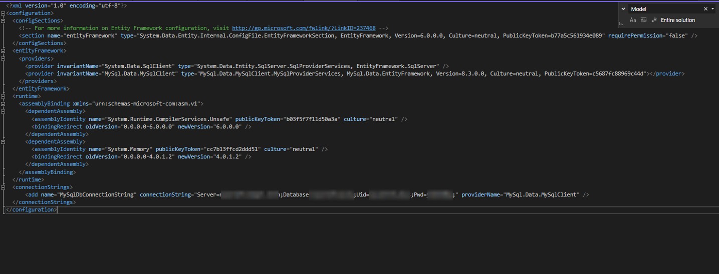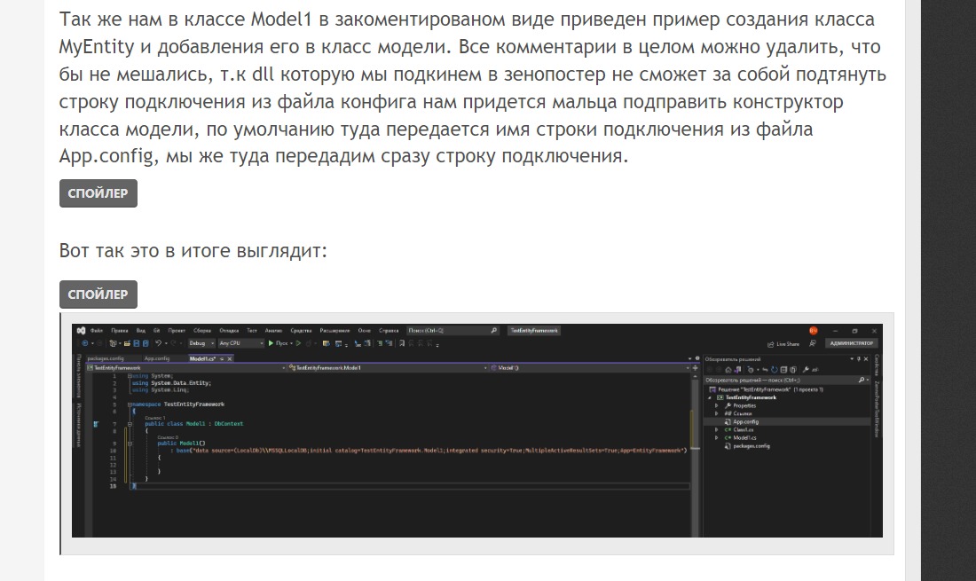 Так же нам в классе Model1 в закоментированом виде приведен пример создания класса MyEntity и добавления его в класс модели. Все комментарии в целом можно удалить, что бы не мешались, т.к dll которую мы подкинем в зенопостер не сможет за собой подтянуть строку подключения из файла конфига нам придется мальца подправить конструктор класса модели, по умолчанию туда передается имя строки подключения из файла App.config, мы же туда передадим сразу строку подключения.