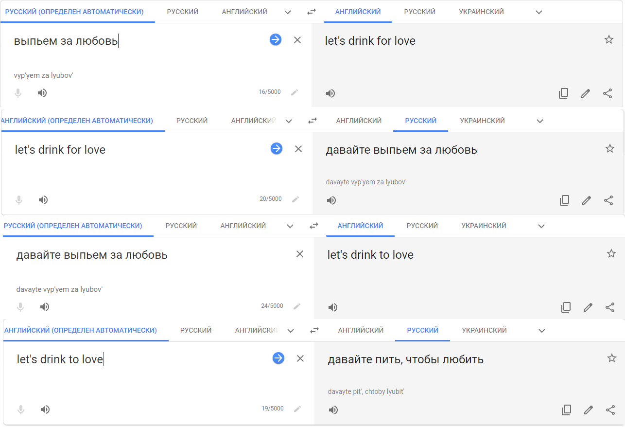 3. беру полученную фразу на нужном языке и перевожу на английский и потом на русский