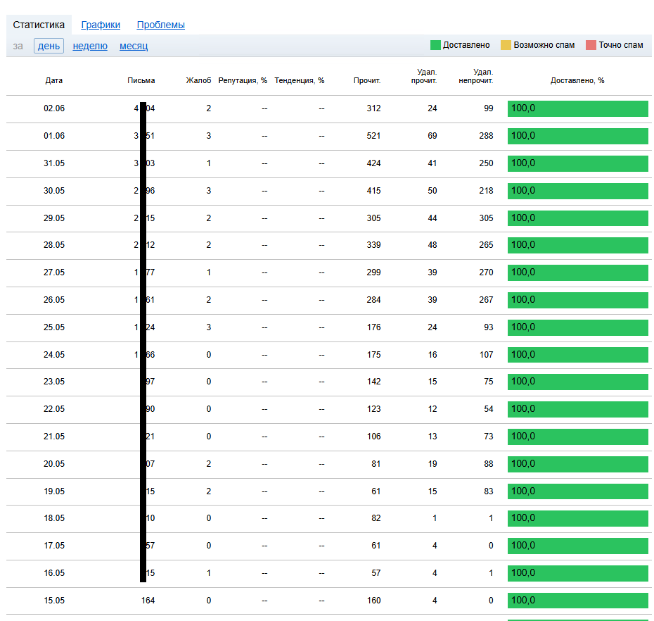 Результат: алгоритмы Mail.ru видят, что ваши письма востребованы, читаются, получатели не жалуются, поэтому накидывает вашим доменам и релейкам желанный траст.Зацените, какую статистику получают наши пользователи, разбавляя коммерческую рассылку с нашим сервисом или прогревая сервера с нуля: