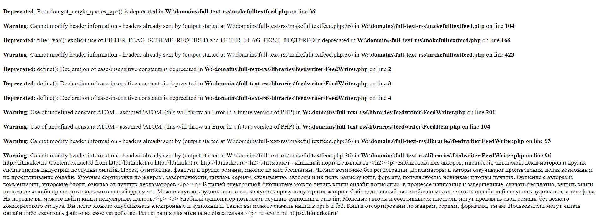 Версия PHP слишком высокая, должна быть 5 версии.с чем может связана данная проблема при работе скрипта full-text-rss?