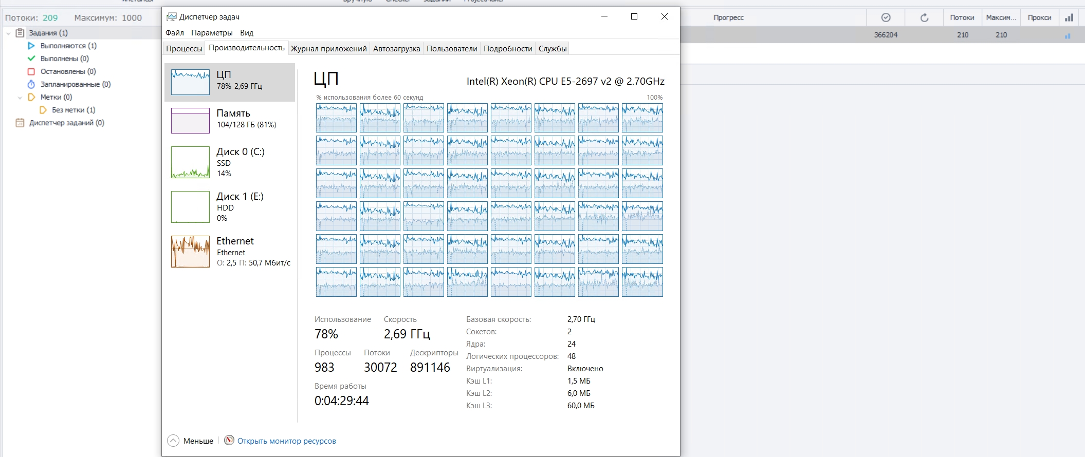 В компе с 5900x явное ограничение по памяти, а по процессору большой запас. Тут запускаться потокам не дает именно память. В компе с Xeon все в "притык" - он явно "на месте", но и памяти у него намного больше)