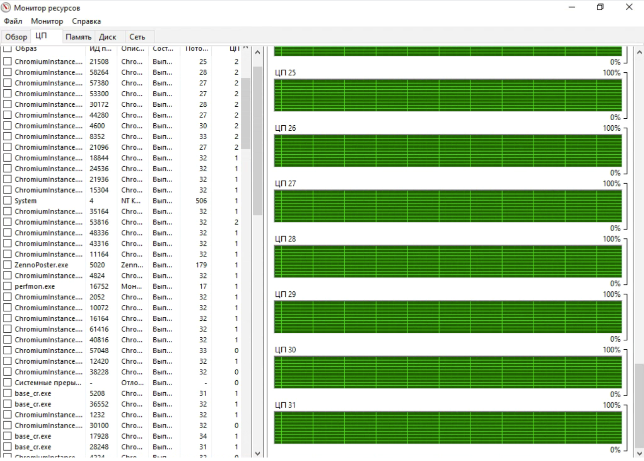 По поводу того что писали на первой странице что зенка не грузит 16 ядер, это бред оптимизируйте шабы! Это где-то 150 браузерных потоков.