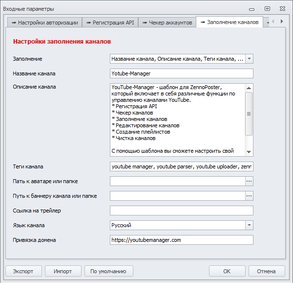 YouTube-Manager - шаблон для ZennoPoster, который включает в себя различные функции по управлению каналами YouTube.