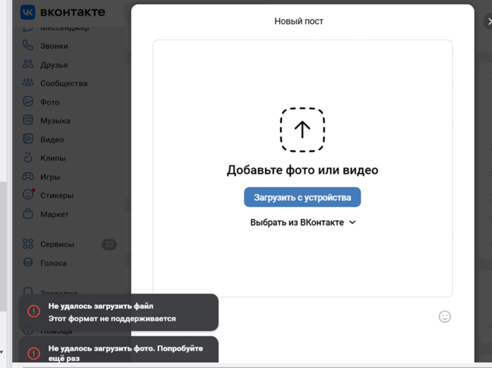 Друзья всем привет, пытаюсь загрузить картинку с постом для вк в группу и почему то не могу загрузить им на сервер , пишет мол не поддерживается формат формат, хотя в ручную все норм грузит , обычный jpg файл. Пути все проверил ошибок нет, а он все равно ругается. Post запросы настраивать не умею, простьба отозваться тем кто знает как на кубиках кликами загрузить. На других сайтах загружал ошибок не было , а вк выеживается.