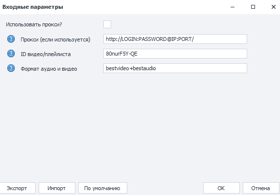 Шаблон рассчитан на загрузку плейлистов и одного видео, также предусмотрена работа с прокси и без него. Можно указать качество загружаемых файлов, по стандарту стоит bestvideo+bestaudio, но для этого потребуется ffmpeg, если его нет, то можно указать mp4 или mp3. Все эти параметры можно указать в входных настройках: