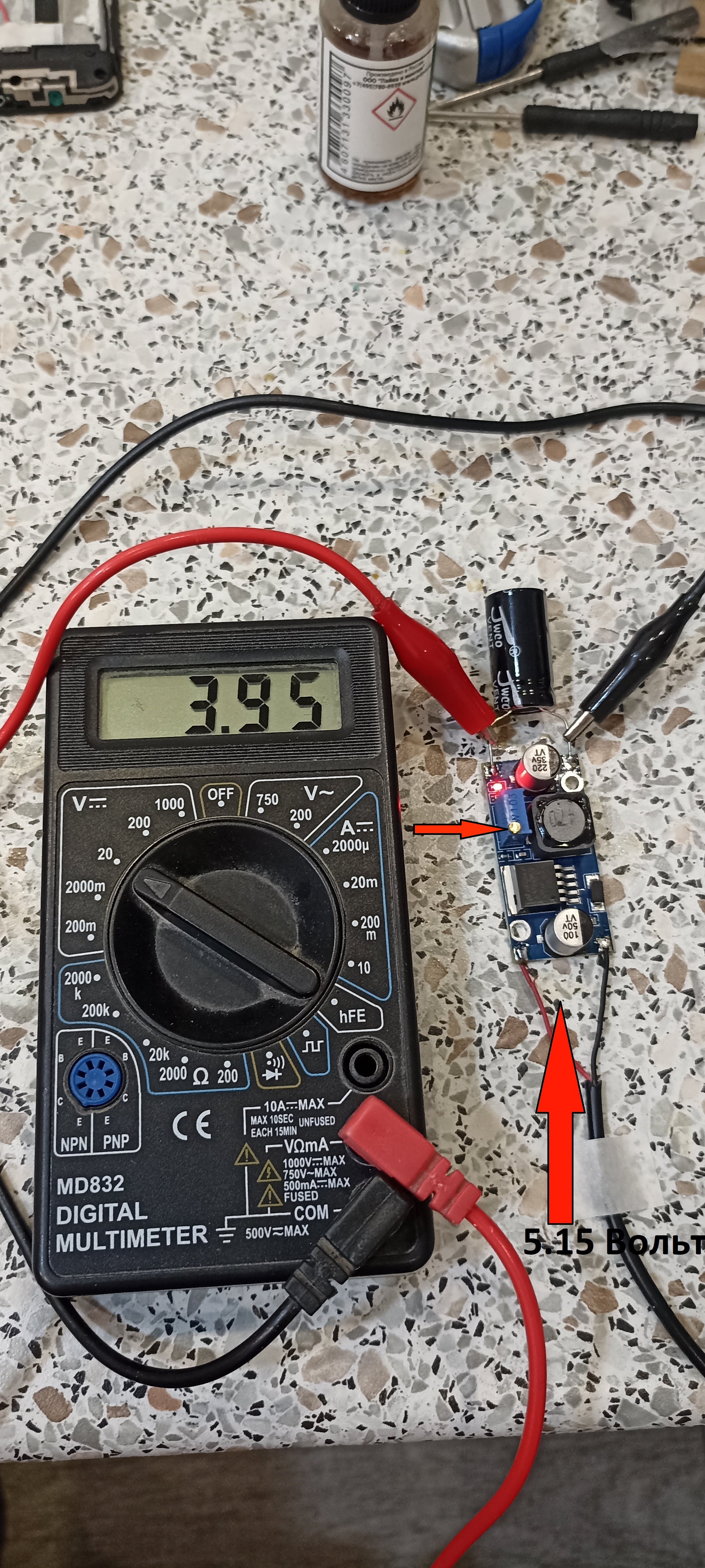 Припаиваем конденсатор к lm 2596. Пытаемся выставить 3.95 вольт это в нашем случае.