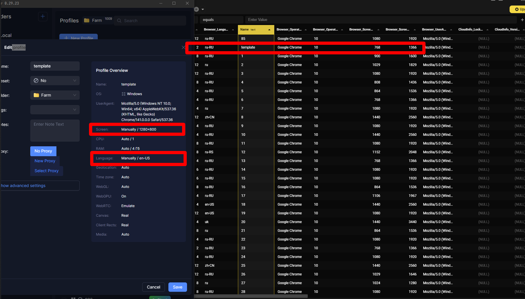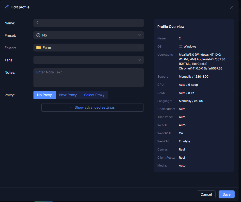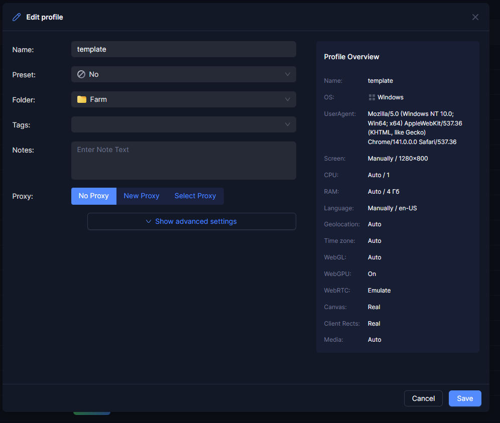 Руками создаем профиль Sample с нужными настройками. Копируем id профиля.