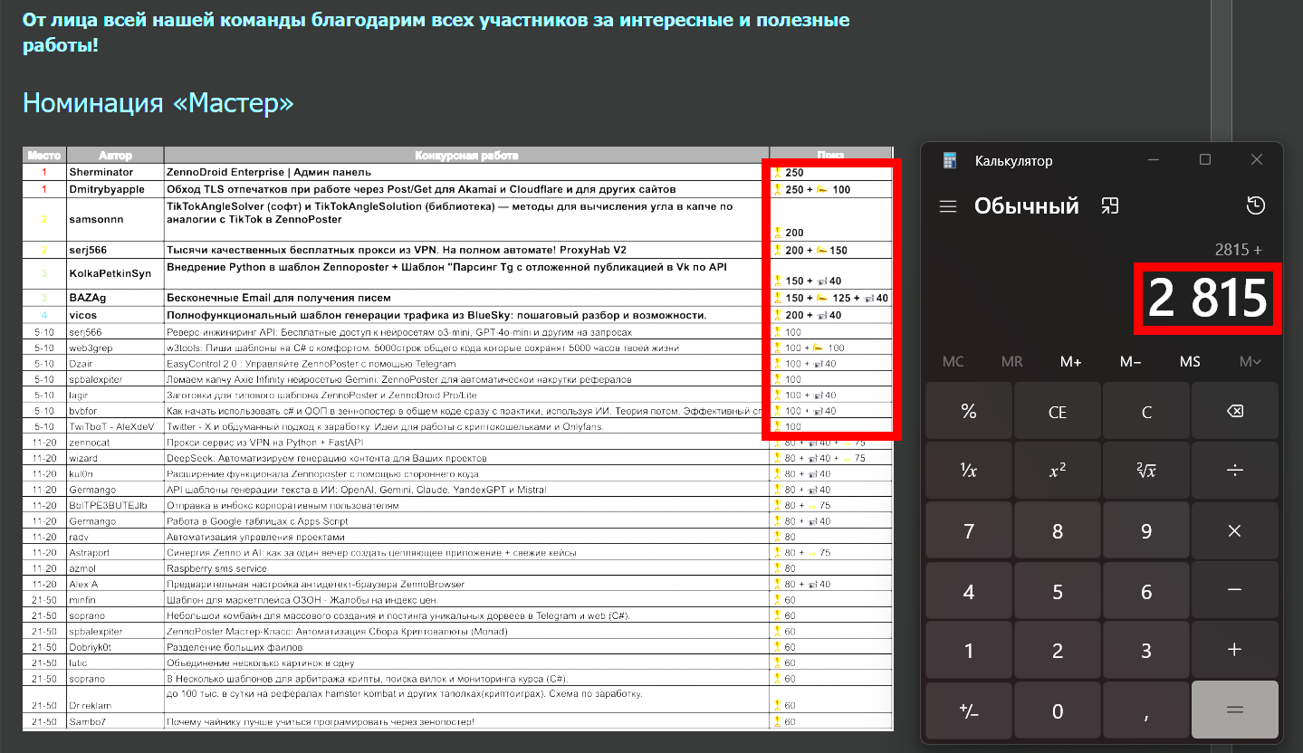 А второй - для новичков (в том числе, потенциальных, у которых еще не куплена лицензия), для которых Зенка, например, просто отличный инструмент под рукой, который помогает решать какие-то рутинные ежедневные задачи (не всегда даже связанные с прямыми схемами заработка). Уверен, статьи о том, как, например, автоматически обработать кучу экселевских таблиц с отчетами будут не особо интересны продвинутым юзерам, а вот какому-нибудь мелкому ИПшнику или помощнику провинциального бухгалтера очень даже зайдут, поскольку решат его головную боль и покажут, как можно сэкономить кучу времени. Причем, он попадет на нее из поиска, почитает и в итоге купит Зенку (думается, это основная задача конкурсов). А потом он в этом же или следующем конкурсе почитает "истории успеха" (кстати, куда-то делись в этот раз, я любил их почитать), заразится энтузиазмом, углубится в изучение и через пять-десять лет уже будет писать статьи на конкурс для взыскательной публики )) Ну и писать на форуме, что Зенка движется не туда.