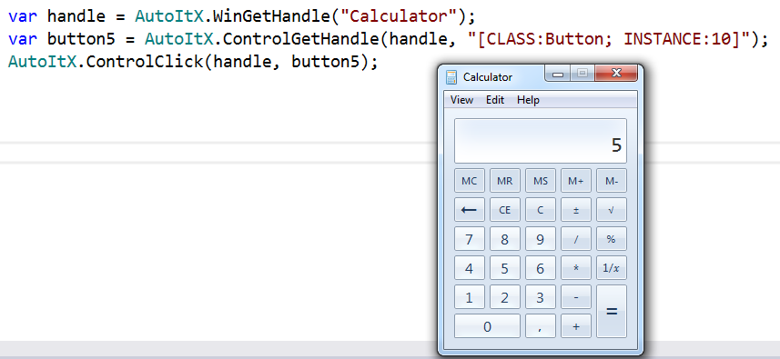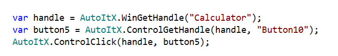 Теперь попробуем нажать любую кнопку. Допустим цифру 5. Но сперва нам надо получить хендл(дескриптор) контрола а затем уже кликать. За это отвечают два метода ControlGetHandle и ControlClick. В принципе из названия понятно что они делают.